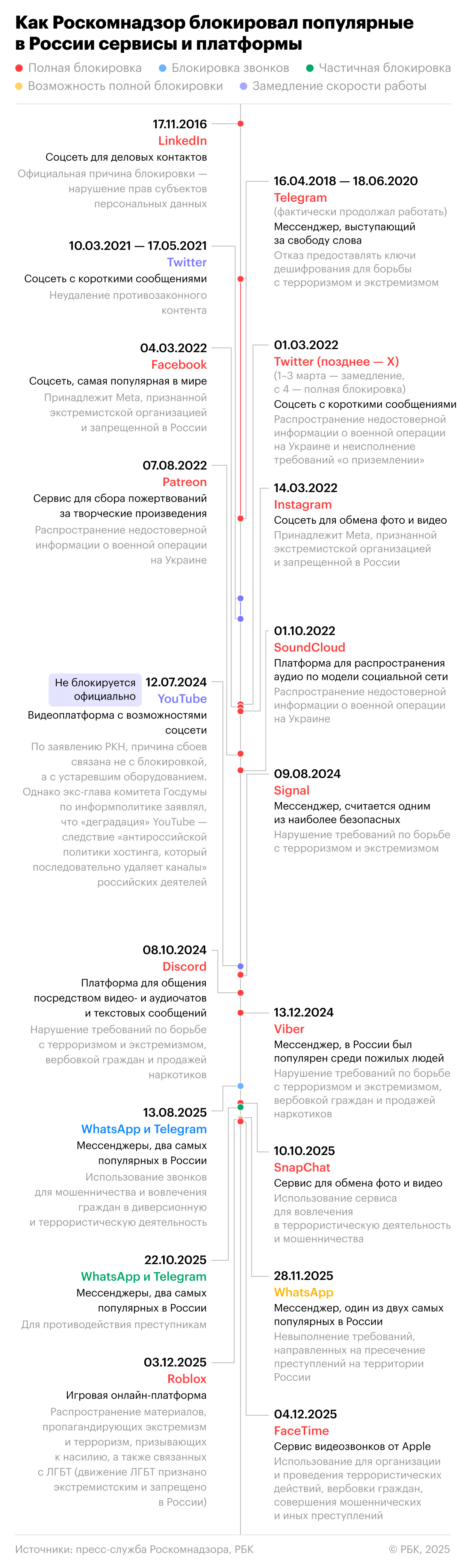 22 октября 2025 года Роскомнадзор объявил о частичном ограничении работы Telegram, а также WhatsApp (принадлежащего компании Meta, признанной экстремистской и запрещенной в России). С 13 августа в Telegram недоступны звонки.