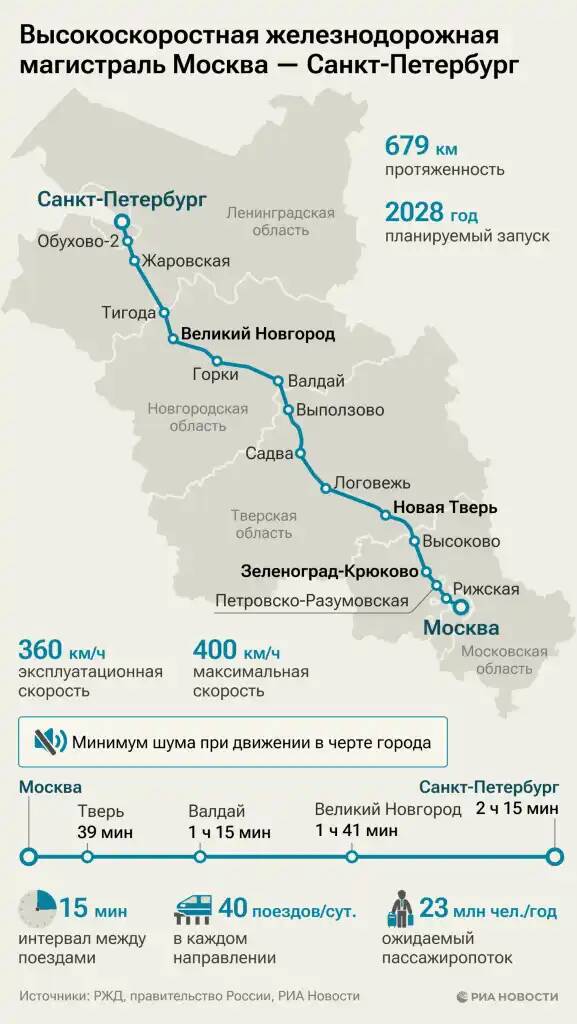 ВСМ, объединяющая Москву и Санкт-Петербург, станет пилотным проектом, на котором время в пути составит два часа пятнадцать минут. Полноценный запуск трассы запланирован на 2028 год, и она свяжет Центральный и Северо-Западный федеральные округа, где проживает около 30% населения.